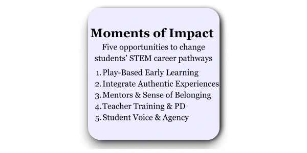 This analysis of research, mostly from 2015-2025, identifies five opportunities in the STEM workforce pipeline to create “Moments of Impact” that can change the direction of a student's STEM education pathway.